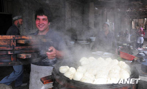 7月12日,一名商販在新疆阿克蘇市規模最大的托克遜巴扎上賣包子。新華社記者 侯俊攝
