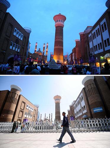 上圖:7月1日,烏魯木齊的新疆國際大巴扎游人如織。 新華社記者 魯煒攝下圖:7月9日,一名行人路過烏魯木齊的新疆國際大巴扎門前。新疆國際大巴扎在“7·5”事件后中止營業。 新華社記者沙達提攝