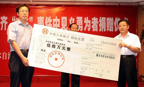 7月16日,國投新疆羅布泊鉀鹽有限責任公司總經理李浩(右)代表公司向“新疆社會治安綜合治理見義勇為基金會”捐款50萬元。當日,新疆社會各界為在烏魯木齊“7·5”事件中見義勇為的群眾踴躍捐款。新華社記者 沙達提 攝