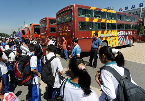 7月16日,學生專用車在烏魯木齊火車西站等候運送學生。新華社記者 李紫恒 攝