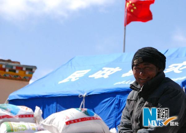 4月26日,一位玉樹縣隆寶鎮(zhèn)措桑村村民在救災帳篷前露出微笑。 新華社記者 文貽煒 攝