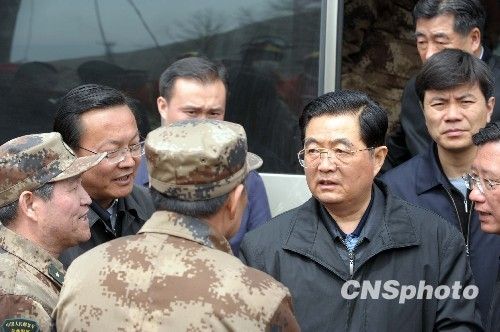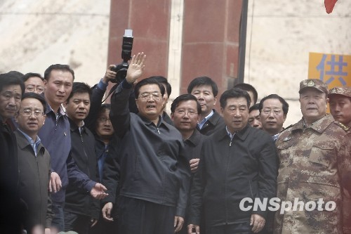 4月18日,中共中央總書記、國家主席、中央軍委主席胡錦濤飛抵玉樹,看望慰問地震災區干部群眾,實地指導抗震救災工作。 中新社發 盛佳鵬 攝