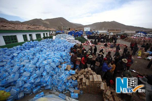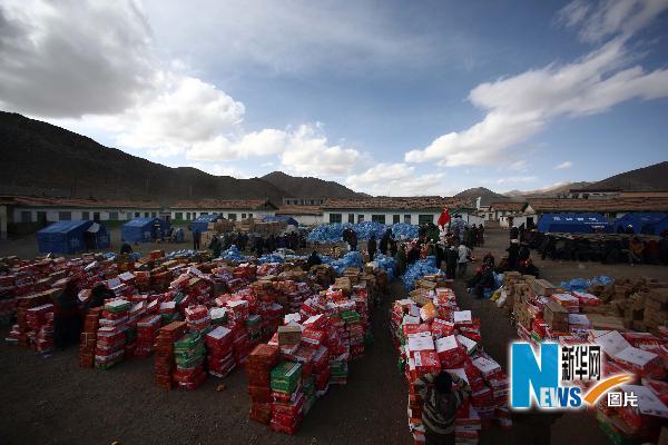 4月22日,牧民們將領(lǐng)到的救援物資分村擺放好。新華社記者費茂華攝