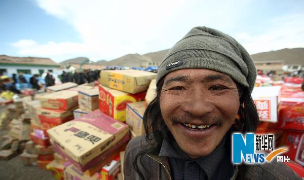 4月22日,隆寶鎮(zhèn)窘青二村牧民白文領(lǐng)到救援物資后露出笑容。新華社記者費茂華攝