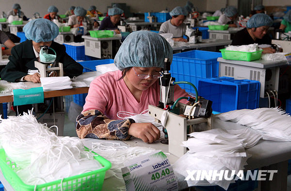 5月13日,在江蘇省泰州市海陵區(qū)九龍鎮(zhèn)一家醫(yī)用制品企業(yè),工人正在按國家統(tǒng)一標(biāo)準(zhǔn)生產(chǎn)口罩。甲型H1N1流感疫情讓口罩成為俏銷貨,泰州企業(yè)在滿負(fù)荷生產(chǎn)的同時(shí),嚴(yán)格操作流程,按國家統(tǒng)一標(biāo)準(zhǔn)生產(chǎn),并落實(shí)質(zhì)量分級(jí)承包責(zé)任制,嚴(yán)禁劣質(zhì)口罩流入市場(chǎng)。新華社發(fā)(顧俊 攝)