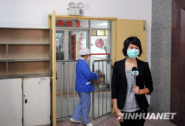 5月22日,一位電視記者在廣州市第八人民醫(yī)院收治廣州市甲型H1N1流感病例的隔離病區(qū)外采訪。