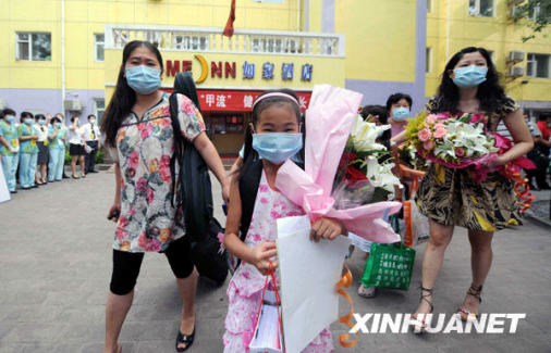7月7日,解除觀察人員走出隔離區。當日,北京朝陽區南湖中園小學絕大部分密切接觸人員被解除為期7天的醫學觀察。7月1日,南湖中園小學首次確診7名學生感染甲型H1N1流感,衛生部門將已查找的154名密切接觸者進行集中醫學觀察。新華社記者 李文 攝