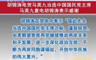 胡錦濤電賀馬英九當選中國國民黨主席 馬英九復電表示感謝