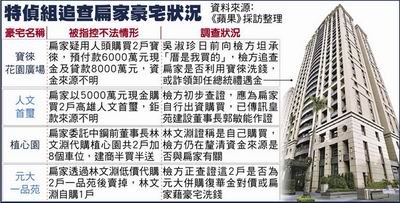 特偵組為追查扁家是否利用購買豪宅洗錢,除調查寶徠及脫手的一品苑外,還鎖定追查扁家的高雄人文首璽2戶豪宅,以及扁家是否委任“中鋼”前董事長林文淵低價代購北市“植心園”2戶豪宅。