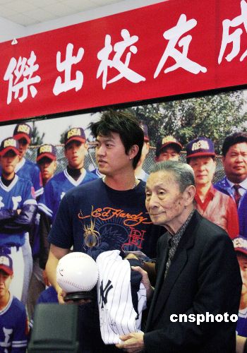 11月23日,臺灣著名棒球明星王建民回到高中母校臺北縣土城私立中華中學,受到學弟、妹們的英雄式歡迎,并成為該中學創校45年以來,獲頒杰出校友獎的第一人。圖為王建民與87歲的中學創辦人卞堃互換紀念品。據悉,中華中學一向是臺灣棒球運動員搖籃,自1981年與榮民工程公司前身榮民工程事業管理處建教合作成立青棒隊起,至今已培育出職棒好手110人,王建民于1996年至1998年就讀該校。中新社發 黃少華 攝