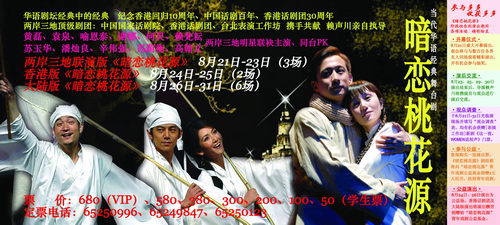 從去年開始風靡華語劇壇的經典舞臺劇《暗戀桃花源》,于今年八月在北京達到觀演高潮。代表內地、香港、臺灣兩岸三地最高演劇水準的中國國家話劇院、香港話劇團、臺北表演工作坊近日聯合宣布,為紀念香港回歸10周年、中國話劇百年、香港話劇團30周年,《暗戀桃花源》將有三個版本于8月21日——31日先后在首都劇場同臺獻演。其中包括:8月21日——23日演出的3場兩岸三地版、8月24——25日演出的2場香港版和8月26日——31日演出的6場大陸版。三個版本將展現不同語言、不同風味的《暗戀桃花源》,并都將配備中英文字幕。