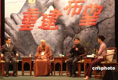 二OO八年六月一日下午,法鼓山文教基金會在臺北市舉辦“重建希望——從四川震災談起座談會”。法鼓山創辦人圣嚴法師(左二)在座談會上宣布,法鼓山要為四川災區重建做六件實事:為綿陽市安縣秀水鎮重建二所小學;為秀水鎮建一所中學;在秀水鎮建一所醫院;為秀水鎮重建自來水廠;重建新村,為村民蓋房子;設立獎學金幫助受災青少年完成從小學到中學的學業。曾主持臺灣“九二一”地震重建的蕭萬長(左一)及著名影星李連杰(右二)也出席座談會。 中新社發 耿軍 攝