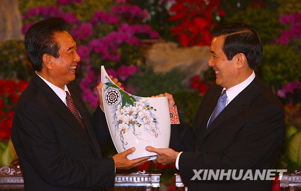 新華網快訊:馬英九與海協會會長陳云林的會面于11時5分許結束,雙方互贈了禮物。