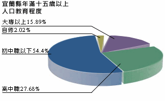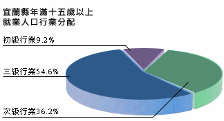 宜蘭縣人口數(shù)近47萬人,滿十五歲以上人口約37萬人,其中教育程度狀況,大專以上15.89%、高中職27.68%、初中職以下54.4%、自修2.02%;至于就業(yè)人口行業(yè)分配狀況為初級行業(yè)9.2%、次級行業(yè)36.2%、三級行業(yè)54.6%,和全臺的平均值初級行業(yè)7.8%、次級行業(yè)37.2%、三級行業(yè)55.0%,相當(dāng)接近。