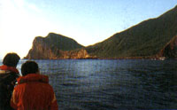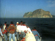 船由島的北方順時鐘繞島而行,龜甲朝西北的這一側,山勢平緩,樹木蓊郁蒼翠,尤以大片的天然蒲葵林最為珍貴;續往東行,硫磺味陣陣撲鼻而來,正是到了火山地質景觀發達的龜首,龜首經年不斷冒出琉磺氣,即著名的“龜島磺煙”,海底出磺口附近是一處海底熱泉。