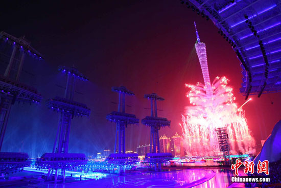 11月12日晚,第16屆廣州亞運會開幕。圖為開幕式現場煙花璀璨。中新社記者 富田 攝