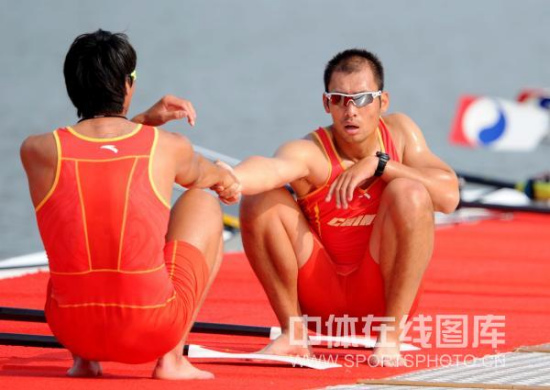 圖文-[賽艇]男子雙人雙槳中國奪冠 奪冠后握手