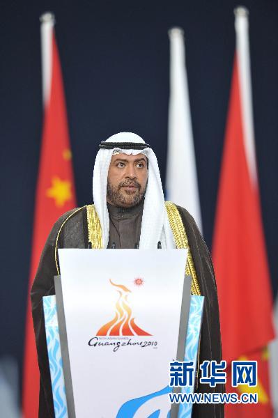 11月27日,亞奧理事會主席艾哈邁德·法赫德·薩巴赫親王(中)致辭。當日,第16屆亞運會閉幕式在廣州市海心沙島舉行。 新華社記者楊磊攝