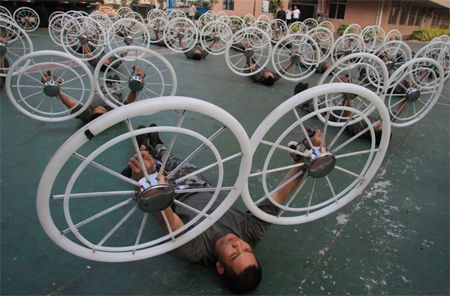 為了高標(biāo)準(zhǔn)完成動(dòng)作,士兵們每周還會(huì)召開(kāi)一次“諸葛亮?xí)保I(xiàn)言獻(xiàn)策,有不少奇招妙點(diǎn)就出自于戰(zhàn)士們,“可以說(shuō)我們是巧練加苦練。”在訓(xùn)練場(chǎng)地上,記者就見(jiàn)到,地面上用粉筆畫(huà)出了無(wú)數(shù)條長(zhǎng)度相同的線(xiàn)條,有士兵解釋說(shuō),節(jié)目需要800人圍成8個(gè)圓圈勻速跑動(dòng),為了達(dá)到最佳的視覺(jué)效果,必須讓人與人之間始終保持1米的距離,同時(shí)保持好隊(duì)形,難度非常大,為此他們想出了這樣的辦法,“用1米的尺子畫(huà)出許多線(xiàn)條,讓訓(xùn)練隊(duì)員反復(fù)看反復(fù)跑,通過(guò)上千次的重復(fù)跑動(dòng),形成分毫不差的距離感。”