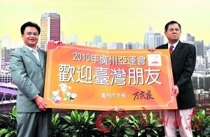 萬慶良向臺灣朋友發(fā)出其親筆簽名的邀請函,熱情地向臺灣民眾介紹廣州亞運、誠摯邀請臺灣民眾共享亞運樂事,體驗亞運之旅。他表示,廣州愿意為臺灣運動員參加廣州亞運會提供最大的協(xié)助和便利以及最好最周到的服務(wù),相信臺灣運動員將繼北京奧運會后再次感受到大陸民眾的熱情和濃烈的主場氛圍,也期待臺灣運動員能夠在亞運會上發(fā)揮優(yōu)勢項目,取得最好成績。