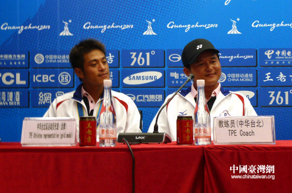 中華臺(tái)北軟式網(wǎng)球男隊(duì)教練方同賢(右)與“首金”功臣劉家綸在賽后出席新聞發(fā)布會(huì)(中國(guó)臺(tái)灣網(wǎng) 李徽 攝)