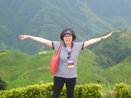 第二天一大早,往龍勝出發(fā),去看那著名的龍瘠梯田,梯田是壯族、瑤族聚居之地,海拔約一千公尺,瑤族世居山上,善于開墾梯田,自龍瘠梯田被人發(fā)現(xiàn)后,世人有感梯田之美,紛紛上山寫生或參觀,因此已發(fā)展成瑤家風(fēng)情旅游勝地。由于空氣中負(fù)離子高,有益人體,又由于通往瑤寨之階梯,均符合人體工學(xué),正好一步,不高不低,所以走起山路來一點也不累,路旁小販販賣各種特色工藝品,寨里的瑤餐,開胃又美味。黃洛瑤的歌舞,幾乎全由女人擔(dān)綱,瑤女個個長發(fā)烏黑如云,最使人羨,因為她們用洗米水洗頭。瑤家的工藝品,色調(diào)鮮艷,價格便宜,有位老婆婆連找錢都不太會算,也做起生意來,非常可愛。瑤家人極質(zhì)樸,愿他們永保這片青山。