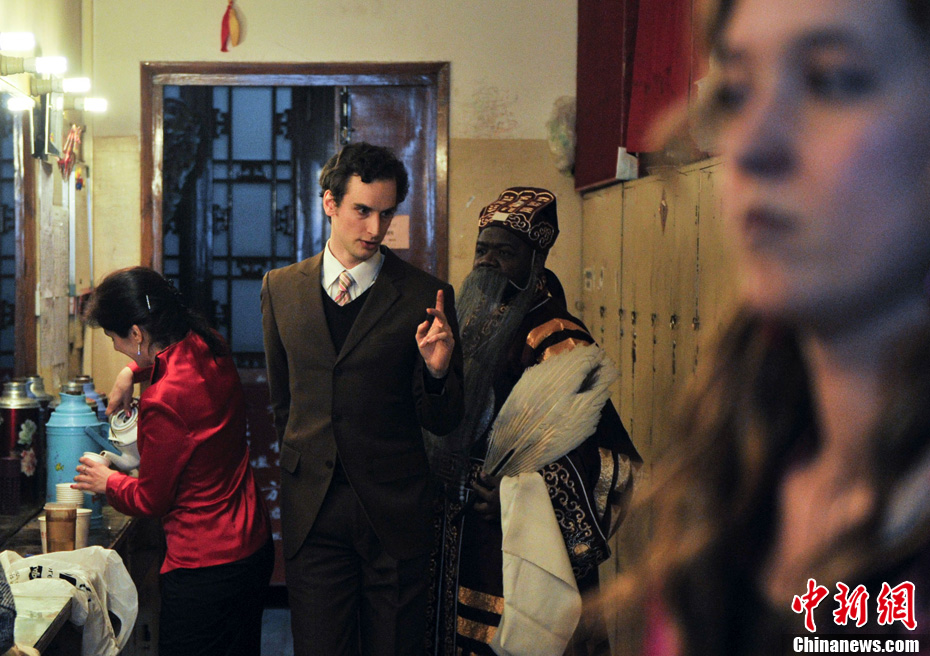 2月13日,首屆外國人鬧元宵中華才藝大聯歡在北京老舍茶館舉行,外國演員們在后臺準備節目。中新社記者 廖攀 攝