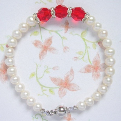 訂做施華洛世奇大紅色水晶5.5-6.5mm白色天然珍珠手鏈