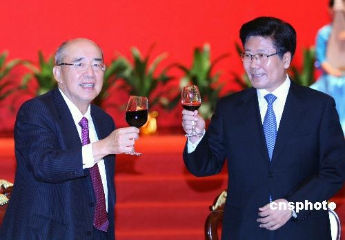 第五屆兩岸經(jīng)貿文化論壇7月11日在長沙開幕,當晚,東道主湖南省委舉行晚宴招待論壇嘉賓。圖為中國國民黨主席吳伯雄(左)與中共湖南省委書記張春賢共同舉杯慶祝論壇開幕。 中新社發(fā) 宋吉河 攝