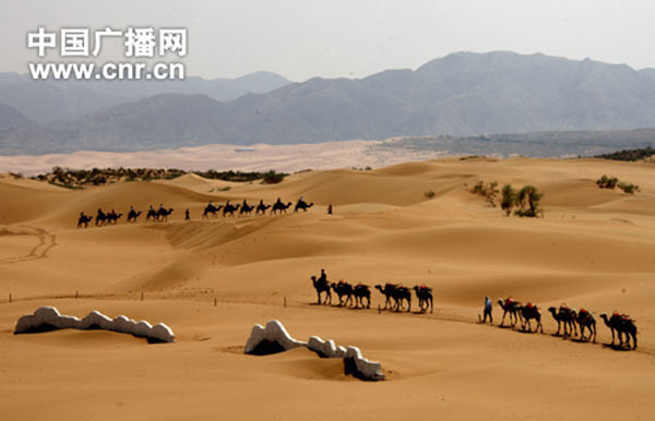 寧夏中衛市沙坡頭景區,勤勞的駱駝接送游客。