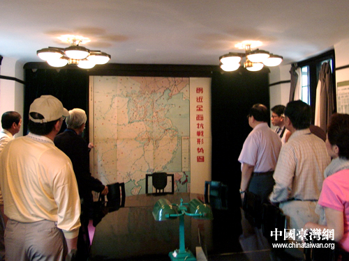 兩岸學者在抗戰時期蔣介石辦公地云岫樓“全面抗戰形勢圖”前駐足觀看