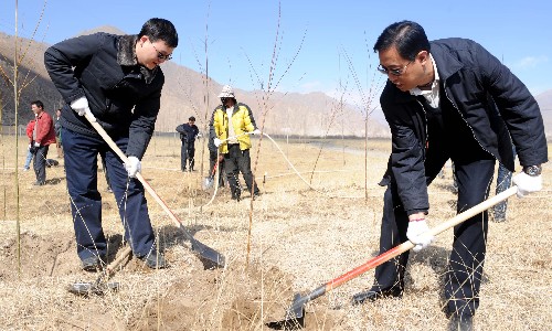 資料圖片:3月11日,北京援藏干部在拉薩河谷植樹。 當(dāng)日,在拉薩市工作的50多名北京援藏干部來到堆龍德慶縣羊達(dá)鄉(xiāng),進(jìn)行植樹活動,創(chuàng)建“援藏林”。 新華社記者 索朗羅布 攝