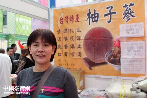 5日上午的西洽會上,第二次參展的臺商楊女士對展會推廣產品的效果很滿意。(中國臺灣網 楊麗 攝)