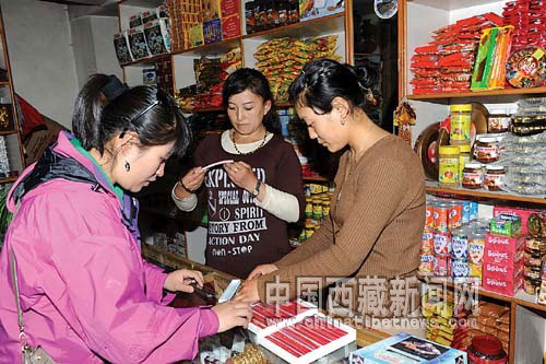 資料圖片:2009年6月,拉薩來的游客白央(左)在樟木口岸一家旅游商店購物。(圖片來源:《西藏日報(bào)》王緒彬 攝)