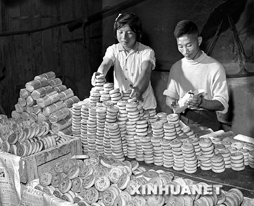 這是1961年9月21日,山西省聞喜縣東鎮(zhèn)供銷合作社的工作人員在包裝月餅,準備供應(yīng)農(nóng)民過中秋節(jié)(資料照片)。 新華社發(fā)