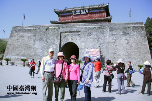 5月5日,臺灣基層民眾參訪團到達山海關。圖為基層民眾代表在天下第一關下合影留念。(中國臺灣網 郜利敏 攝)