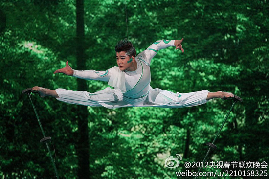 富有詩意的名字《空山竹語》卻是暗藏玄機。這是一個高難度的雜技節目。主舞臺彩幕和立體景觀營造的竹海,與身著白色長衫的雜技演員搖擺的“翠竹”隨風飛舞,一切輕靈飄逸。